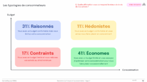 Parmi les 4 typologies de consommateurs affichées par le baromètre, 89% des français sont particulièrement attentifs à leur consommation soit parce qu’ils y sont contraints, soit parce qu’ils sont prudents.