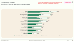Il est intéressant de noter que dans ce contexte, les consommateurs sont de plus en plus sensibles aux opérations commerciales. Une part grandissante des intentions d’achat sont attribuées aux sollicitations des fêtes et agendas promotionnels. Par exemple si 28 % des français ont déclaré avoir réalisé des achats à l’occasion du Black Friday 2024, ils sont 61% à déclarer avoir l’intention de le refaire dans le futur. Phénomène encore plus marqué pour des opérations Blanc, French Days ou les Foires aux vins.