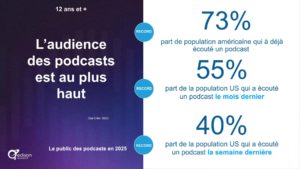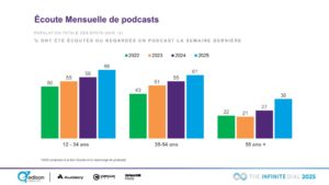 L’évolution est significative et toutes les générations sont concernées. Le podcast est désormais un média transversal, à la fois culturel et social. Il dépasse les frontières d’âge et d’usage. Il se décline en audio et en vidéo.
