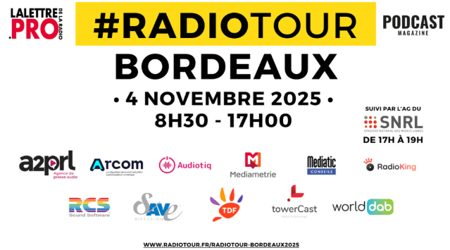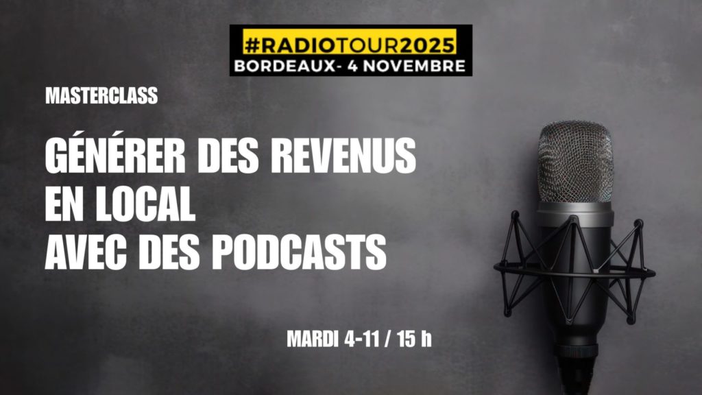 Après Boulogne en octobre, le RadioTour 2025 fera étape à Bordeaux, le mardi 4 novembre à l’hôtel Pullman Bordeaux Lac. Au programme, tables rondes, conférences et Masterclass Express sur le thème de la proximité augmentée. Ne manquez pas la Masterclass « Comment générer des revenus en local avec des Podcasts », animée en tandem par Jean-François Duplaix et Michel Colin de Mediatic Conseils.