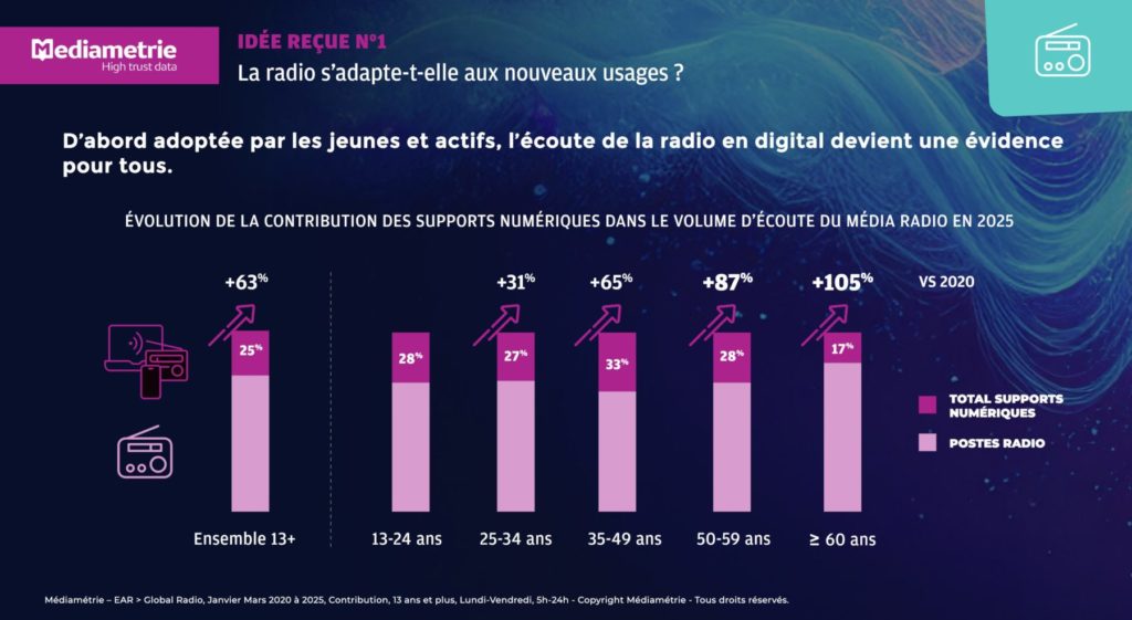 L’usage se démocratise : les supports numériques contribuent désormais à 25 % de l’écoute totale, jusqu’à 33 % chez les 35-49 ans.