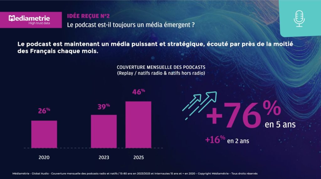 Près d’un Français sur deux écoute un podcast chaque mois (46 %, +76 % depuis 2020). La dynamique reste extrêmement forte.