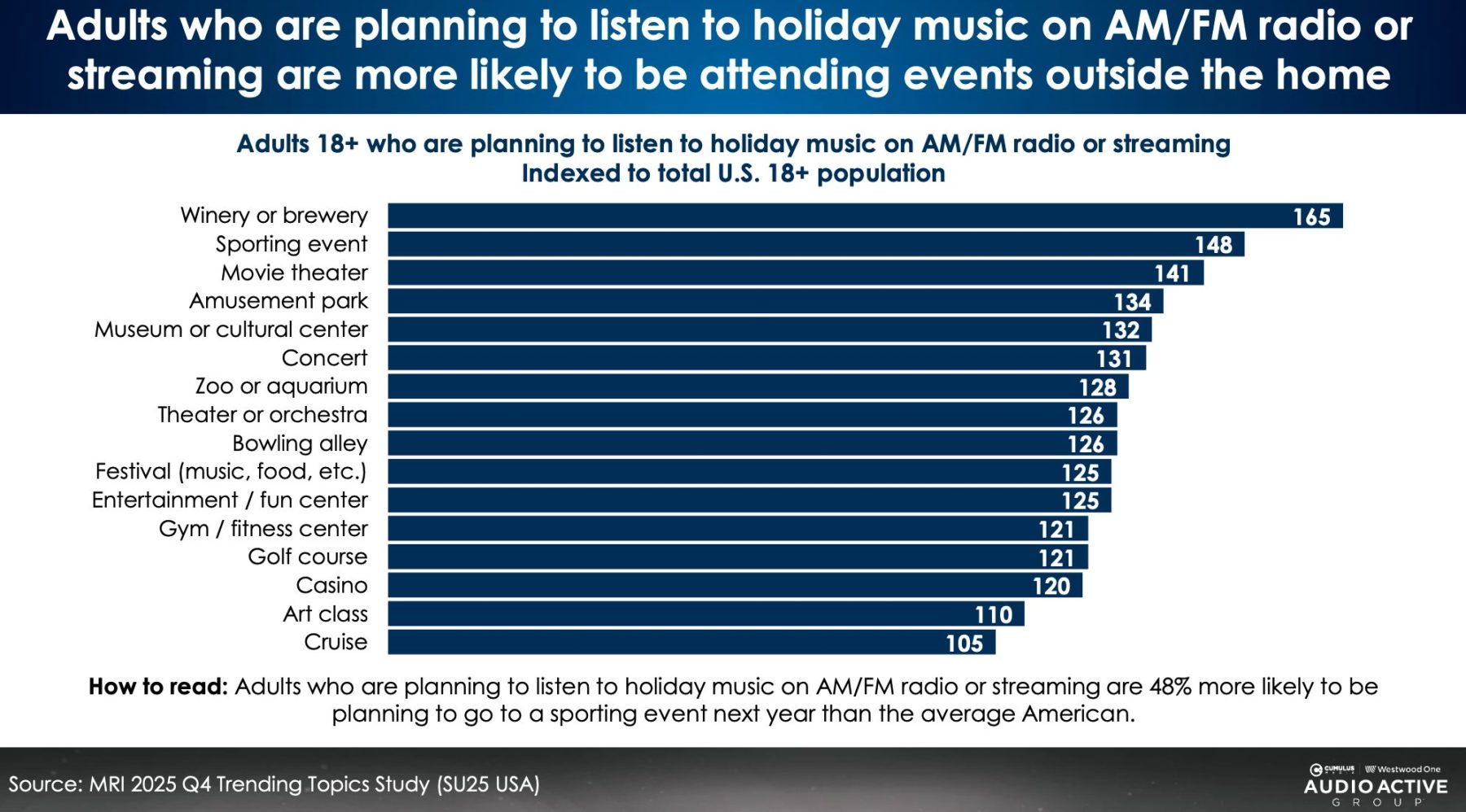 Les adultes qui écoutent de la musique de Noël à la radio sont beaucoup plus actifs et plus enclins à sortir, avec des indices très élevés sur les concerts, musées, cinémas, événements sportifs, parcs, etc.