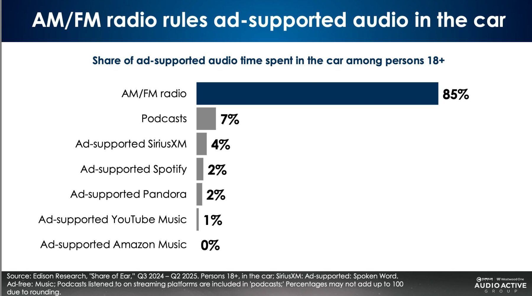 Selon Share of Ear, la radio capte 85 % du temps d’écoute audio ad-supported en voiture. Spotify, YouTube Music, Amazon Music ou Pandora restent marginaux.