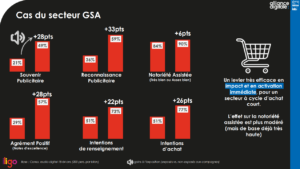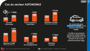 Sur les quatre campagnes analysées, l’intention d’achat moyenne progresse de +28 % après exposition audio digitale. L’effet est particulièrement fort pour les secteurs de la distribution et de l’auto.