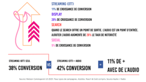 Autrement dit, l’audio n’est pas un canal supplémentaire, mais un multiplicateur d’efficacité. Pour les annonceurs locaux, cela signifie qu’un plan combinant réseaux sociaux, affichage digital et audio en streaming peut générer plus d’impact qu’une campagne uniquement visuelle.