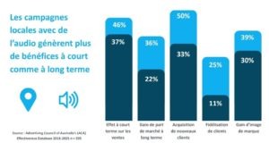 Les données australiennes montrent aussi que l’audio ne se limite pas à créer de la couverture ou de la répétition. Les campagnes qui intègrent de l’audio performent mieux sur plusieurs critères concrets :