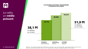 La radio combine une mesure claire, une couverture massive et un usage éditorialisé, régulier et localisable. 38,1 millions d’auditeurs chaque jour, 47,2 millions chaque semaine et 51,9 millions sur un mois.