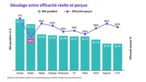 Pourquoi tant d’annonceurs continuent-ils à sous-estimer la radio alors qu’elle affiche l’un des meilleurs retours sur investissement du marché ? Selon Nielsen, la radio arrive dernière en efficacité perçue chez les marketeurs, mais presque tout en haut du classement en ROI réel.
