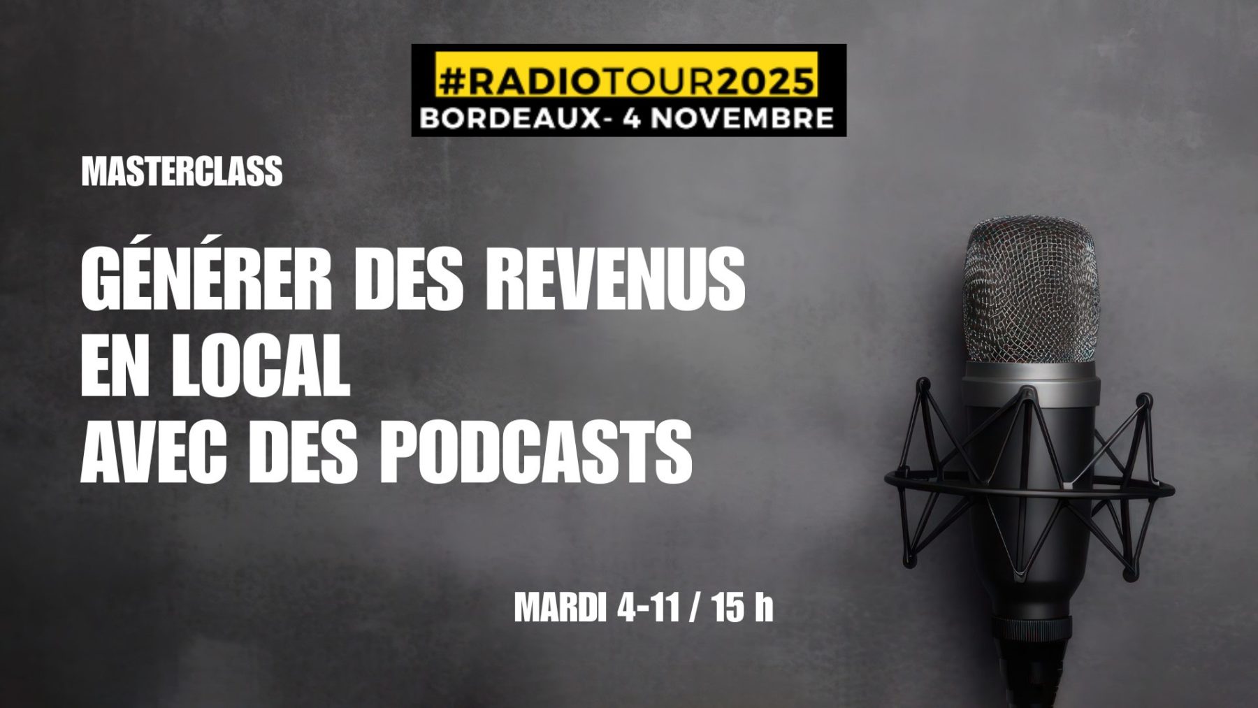 Après Boulogne en octobre, le RadioTour 2025 fera étape à Bordeaux, le mardi 4 novembre à l’hôtel Pullman Bordeaux Lac. Au programme, tables rondes, conférences et Masterclass Express sur le thème de la proximité augmentée. Ne manquez pas la Masterclass « Comment générer des revenus en local avec des Podcasts », animée